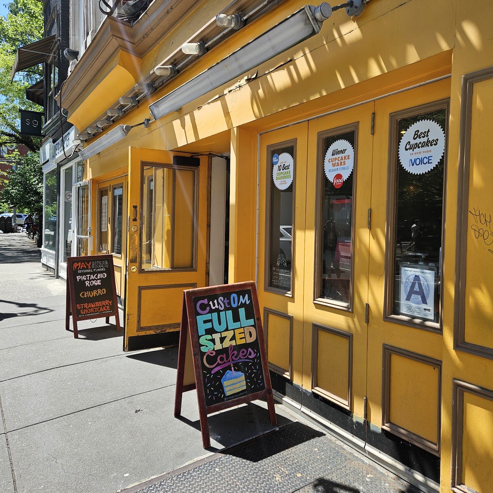Cheerful Bleecker Street cupcake shop with coffee, cookies, pies, and ice cream.